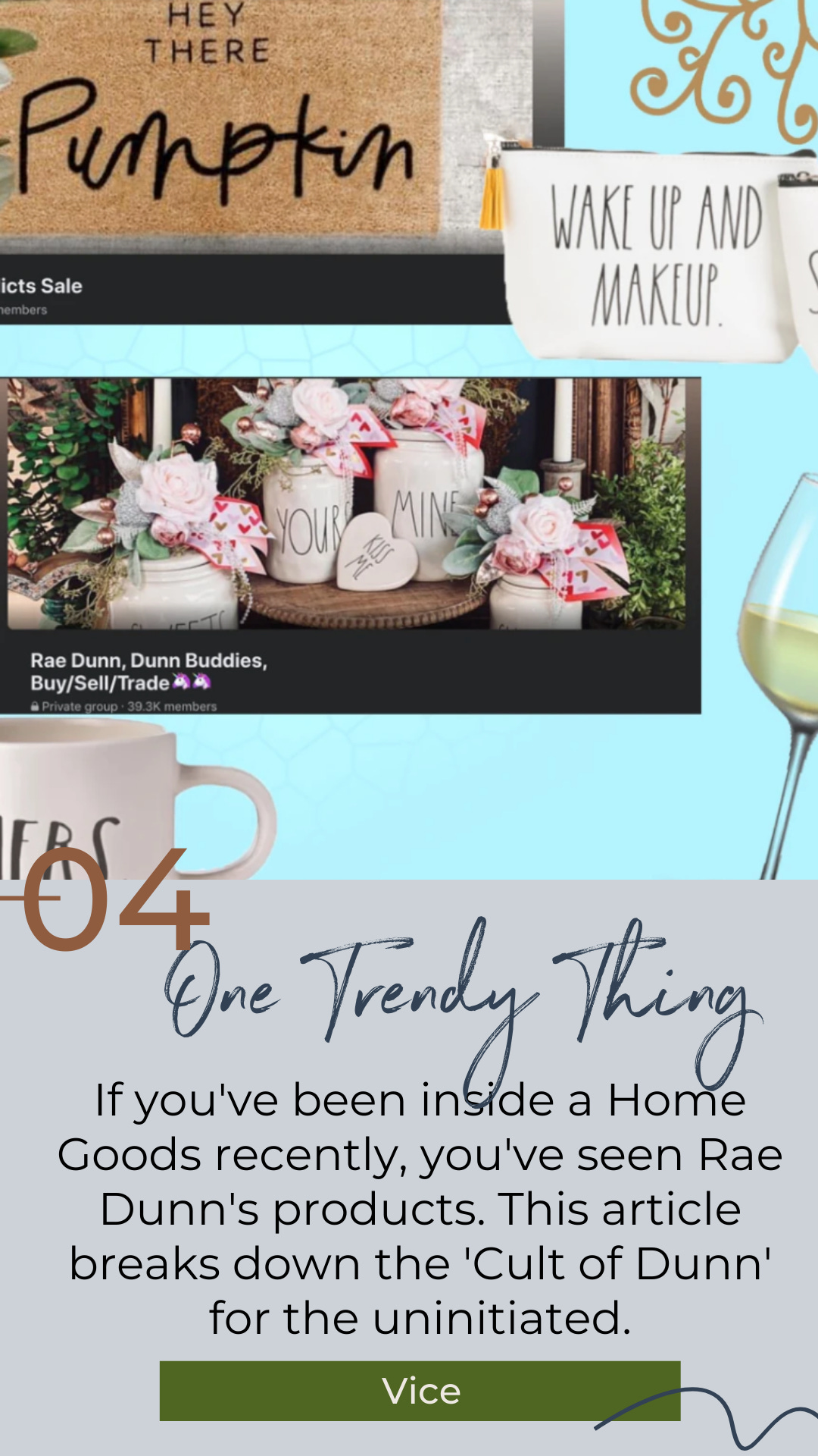Who is Rae Dunn, and why do I see her coffee mugs everywhere? For the uninitiated, Vice invites you into the ‘cult of Dunn’ and shows you how one company has taken over middle-class kitsch.