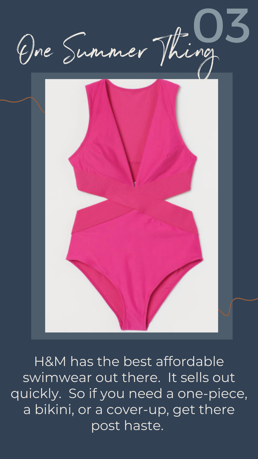 H&M sells wonderful swimwear. It’s stylish, fairly well-made and well-priced. This hot pink one piece if risqué in the best way. Want something stylish but more low-key? This scallop-edge suit is sublime.